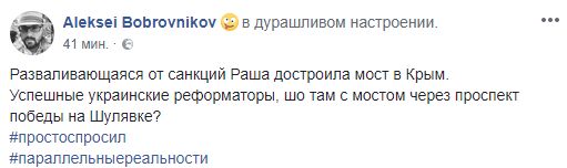А журналист Алексей Бобровников напоминает: "Разваливающаяся от санкций Раша достроила мост в Крым. Успешные украинские реформаторы, шо там с мостом через проспект победы на Шулявке?"