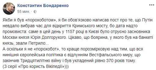 19.46 Политолог Константин Бондаренко на волне сегодняшнего события подмечает любопытное совпадение: "Если бы я был "порохоботом", я бы обязательно написал пост о том, что Путин неудачно выбрал время для открытия Крымского моста, потому что дата слишком красноречивая: именно в этот день в 1157 году в Киеве был отравлен основателя Москвы князя Юрия Долгорукого. Интересно, что боярина, у которого был на банкете князь, звали Петрило ..."