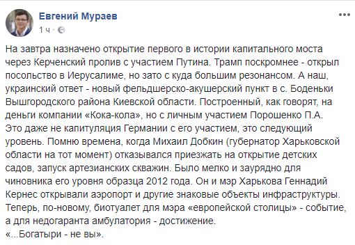 15.56 Народный депутат Евгений Мураев пишет:"На завтра назначено открытие первого в истории капитального моста через Керченский пролив с участием Путина. Трамп поскромнее - открыл посольство в Иерусалиме, но зато с куда большим резонансом. А наш, украинский ответ - новый фельдшерско-акушерский пункт в с. Боденьки Вышгородского района Киевской области. Построенный, как говорят, на деньги компании "Кока-кола", но с личным участием Порошенко П.А.
