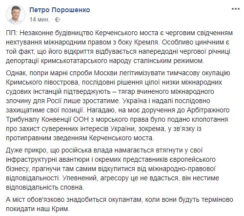 15.40 На открытие КРымского моста отреагировал президент Украины Петр Порошенко. На его странице в Facebook опубликован такой пост: "Незаконное строительство Керченского моста является очередным свидетельством пренебрежения международным правом со стороны Кремля. Особенно циничным является тот факт, что его открытие происходит накануне очередной годовщины депортации крымскотатарского народа сталинским режимом.