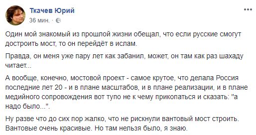 16.00 Одесский журналист Юрий Ткачев: "Мостовой проект - самое крутое, что делала Россия последние лет 20 - и в плане масштабов, и в плане реализации, и в плане медийного сопровождения вот тупо не к чему прикопаться и сказать: "а надо было...".