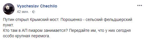 В свою очередь, журналист Вячеслав Чечило сравнивает мероприятия, проведенные Путиным и Порошенко: "Путин открыл Крымский мост. Порошенко - сельский фельдшерский пункт.