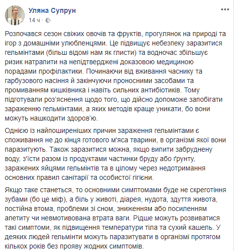 В случае выявления гельминтов нужно следовать рекомендациям врача, которые он предоставит на основе ваших симптомов и результатов анализов. И не забывать об основных правилах гигиены", - написала в соцсети Ульяна Супрун.