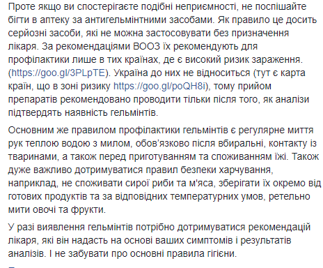 "Как правило, это достаточно серьезные средства, которые нельзя применять без назначения врача. По рекомендациям ВОЗ их рекомендуют для профилактики только в тех странах, где есть высокий риск заражения. Украина к ним не относится, поэтому прием препаратов рекомендуется проводить только после того, как анализы подтвердят наличие гельминтов.