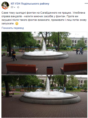 "Именно поэтому сегодня фонтан на Сагайдачного не работает. Любимое дело вандалов - налить моющих средств в фонтан. Однако мы вынуждены после такого фонтан выключать, промывать и только потом снова запускать", - говорится в сообщении коммунальщиков в соцсети.