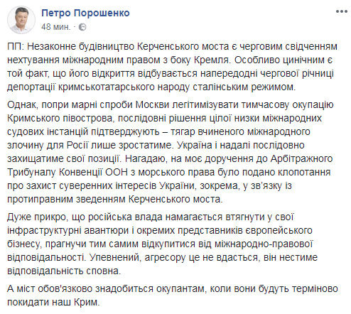 "Незаконное строительство Керченского моста является очередным свидетельством пренебрежения международным правом со стороны Кремля. Особенно циничным является тот факт, что его открытие происходит накануне очередной годовщины депортации крымскотатарского народа сталинским режимом.