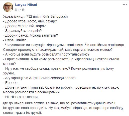 Писательница пишет, что ей утром предложили чай и кофе на русском языке. Она поинтересовалась у проводницы, почему та говорит не на украинском языке, хотя работает в "Укрзализныце". В ответ девушка пояснила, что в Украине есть свобода слова и "каждый разговаривает, как ему удобно".