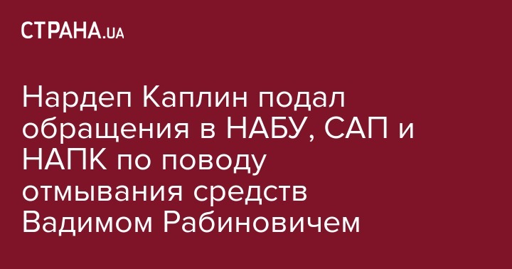 Нардеп Каплин подал обращения в НАБУ, САП и НАПК по поводу отмывания средств Вадимом Рабиновичем