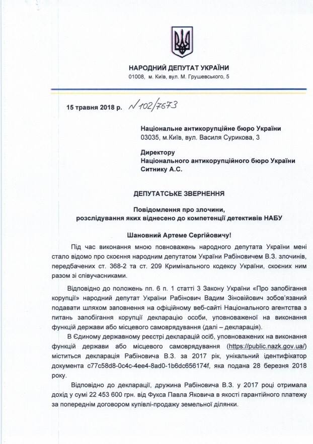 "В своей декларации за 2017 Рабинович отметил доход жены в сумме 22453600 грн. от Павла Фукса, как гарантийного платежа по предварительному договору купли-продажи земельного участка. Нашел этот земельный участок. Ее рыночная стоимость в 18 раз ниже, чем та, за которую ее согласился купить Фукс! Даже Ляшко со своими выигрышами в лотерею не вызывает столько отвращения, как Рабинович, который заявляет, что он продал землю в селе Иванков Киевской области по цене земли в старом городе в Иерусалиме", пишет Каплин.