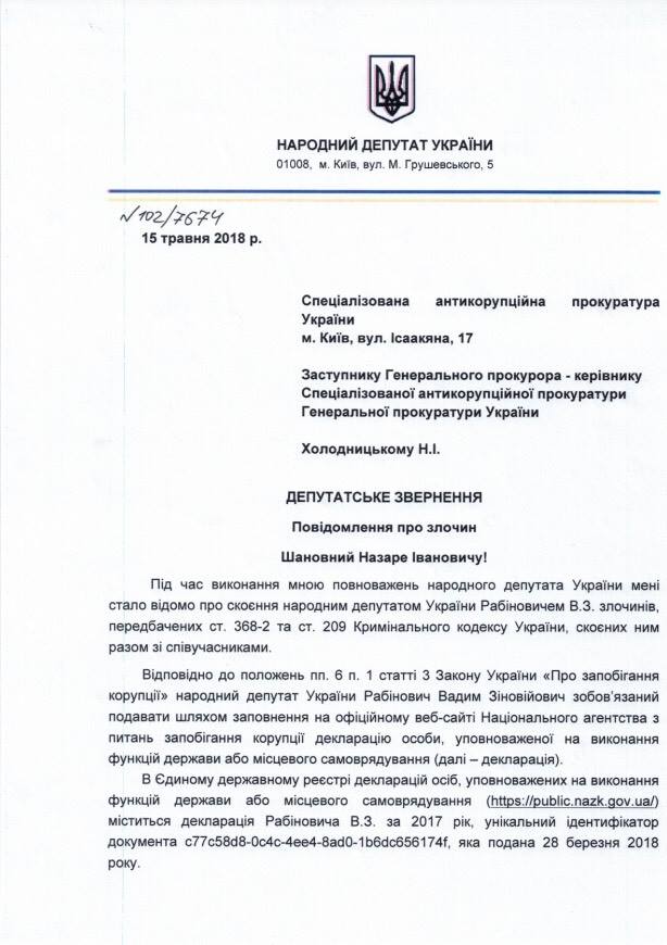 Народный депутат Сергей Каплин подал документы в НАБУ, САП и НАПК по поводу легализации и отмывания доходов, якобы полученных преступным путем Вадимом Рабиновичем.