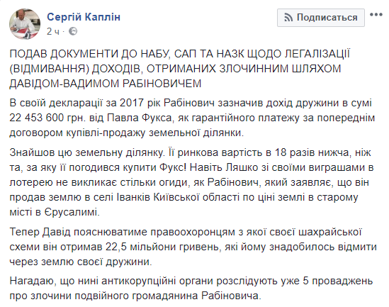 "Теперь Давид объяснит правоохранителям с какой своей мошеннической схемы он получил 22,5 миллиона гривен, которые ему понадобилось отмыть через земли своей жены. Напомню, что сейчас антикоррупционные органы расследуют уже 5 производств о преступлениях двойного гражданина Рабиновича", утверждает Каплин.