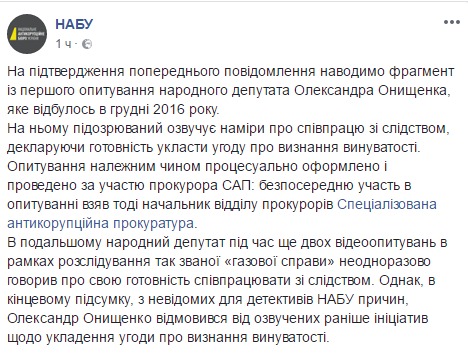НАБУ также выложил видео фрагмента первого опроса Онищенко детективом НАБУ с участием прокурора САП (декабрь 2016 года), в котором нардеп озвучивает намерения о сотрудничестве со следствием и заявляет о готовности заключить соглашение о признании виновности. В частности, как следует из видео, он предложил НАБУ "сотрудничество, сделку… готов предоставить все факты, готов это всё делать тихо, нигде ничего не показывать, не раскачивать ситуацию".