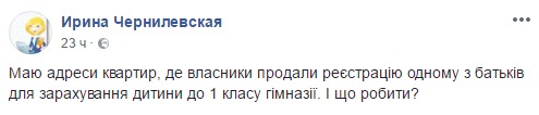 Ирина Чернилевская, директор киевской гимназии №179 (Голосеевский район) пожаловалась в facebook на то, что  родители купили регистрацию для того, чтобы ребенок учился именно в этой школе.