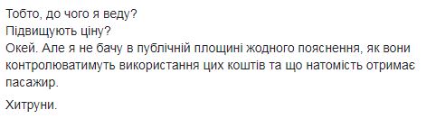 Ольга Прядко добавила: "Если так пойдет, дешевле будет скидываться и покупать автобус в складчину группам лиц, которым нужно ездить в одном направлении))) Ну или купил автобус, подъехал к остановке, спросил кто в одном направлении с тобой, набрал, все скинулись по пятерику и вперед)))."