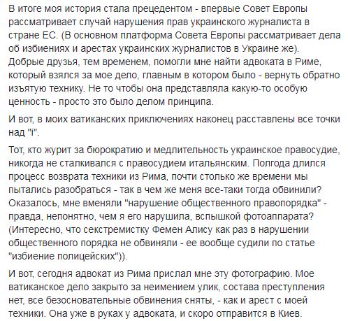 И вот, сегодня адвокат из Рима прислал ей эту фотографию. "Мое ватиканское дело закрыто за неимением улик, состава преступления нет, все безосновательные обвинения сняты, - как и арест с моей техники. Она уже в руках у адвоката, и скоро отправится в Киев. Для полной картины еще, конечно, не хватает официальных извинений римской полиции, но я не гордая - переживу)", - отмечает журналист "Страны".