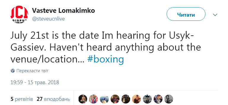Новой датой мульти-чемпионского боксерского поединка Всемирной боксёрской супер серии (WBSS) между Александром Усиком и Муратом Гассиевым выбрано 21 июля 2018.