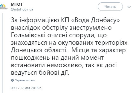 По данным КП Вода Донбасса, в результате обстрела без электроснабжения остались  Гольмовские очистные сооружения, которые расположены на оккупированных территориях Донецкой области.