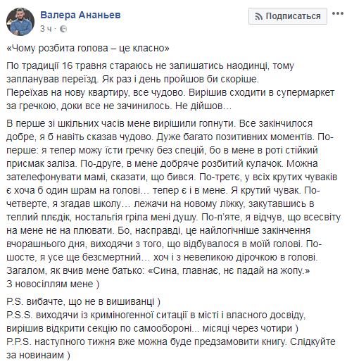 В столице неизвестные совершили нападение на участника АТО и блогера Валерия Ананьева.