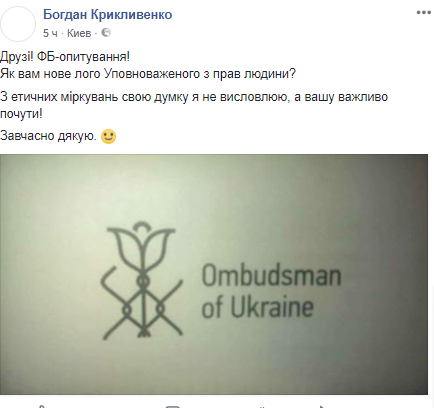 "Друзья! Facebook-опрос! Как вам новое лого Уполномоченного по правам человека? По этическим соображениям свое мнение я не высказываю, а ваше важно услышать! Заранее благодарю", - написал в соцсети Крикливенко.