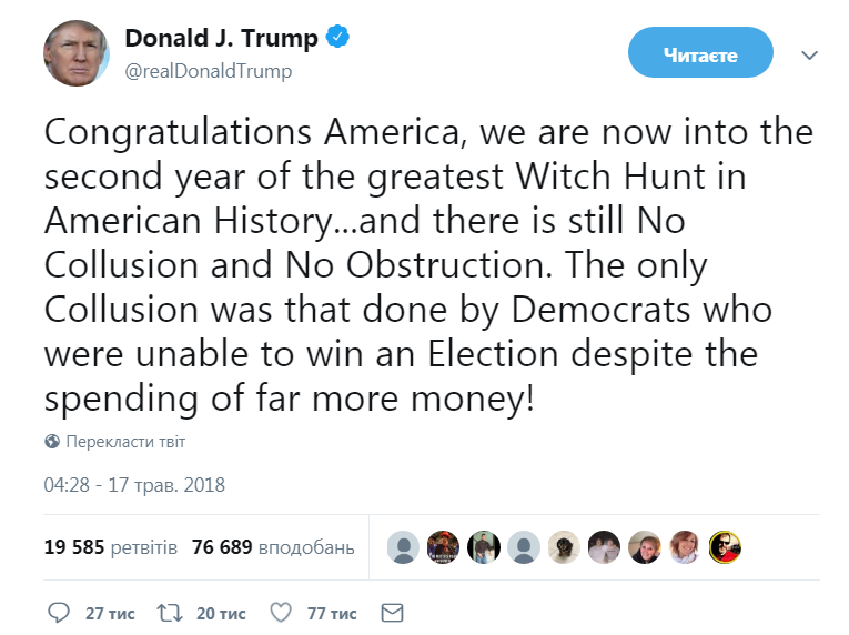 "Поздравляю Америку, мы вступаем во второй год величайшей охоты на ведьм в американской истории… и здесь до сих пор нет сговора и обструкций. Единственным сговором было то, что делали демократы, которые оказались не способны выиграть выборы, потратив гораздо больше денег!" – написал президент США в своем Twitter-микроблоге.