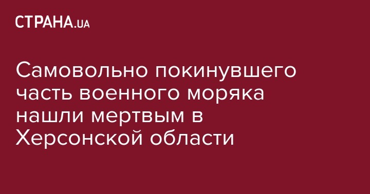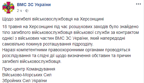 "18 мая в Херсонской области во время розыскных мероприятий было обнаружено тело погибшего военнослужащего военной службы по контракту одной из воинских частей ВМС ВС Украины, который накануне самовольно покинул расположение подразделения", - сообщает пресс-центр командования ВМС ВСУ в пятницу вечером.