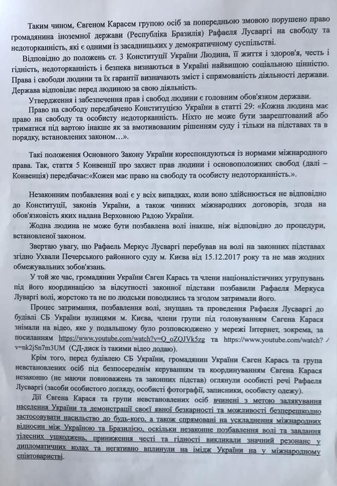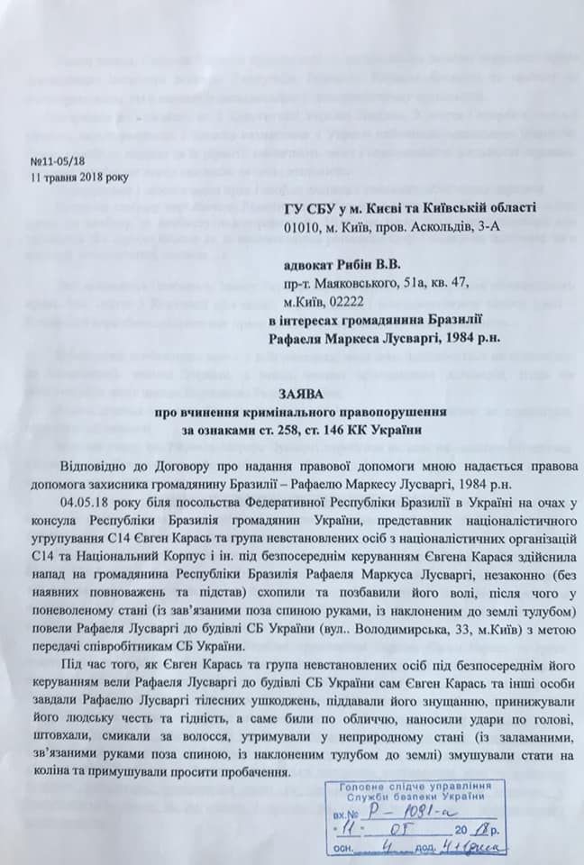 Согласно заявлению, группа националистов под руководством Карася избила и унизила честь и достоинство Лусварги, который находился на свободе на законных основаниях, настолько, что инцидент может стать причиной международного скандала между Украиной и Бразилией.