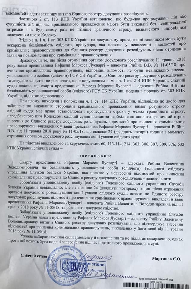 При этом Рыбин обнародовал и соответствующие документы: заявление в СБУ с просьбой внести в Единый реестр досудебных расследований сведения о совершении противоправных действий в отношении его подзащитного членами организаций С14 и Нацкорпус под руководством Карася по стт.146 и 258 УКУ, и решение суда, обязывающее следователя СБУ внести сведения в ЕРДР и выдать адвокату выписку из реестра