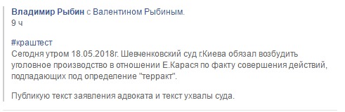 "Сегодня утром 18.05.2018г. Шевченковский суд г.Киева обязал возбудить уголовное производство в отношении Е.Карася по факту совершения действий, подпадающих под определение "терракт ", — говорится в сообщении.
