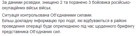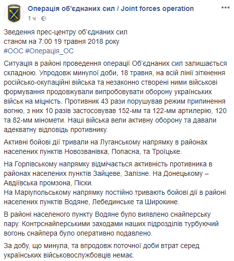 "За прошедшие сутки, 18 мая, на всей линии соприкосновения незаконно созданные военные формирования продолжали испытывать оборону украинских войск на прочность. Наши войска вели активную оборону и давали адекватный ответ противнику", – сказано в сообщении.