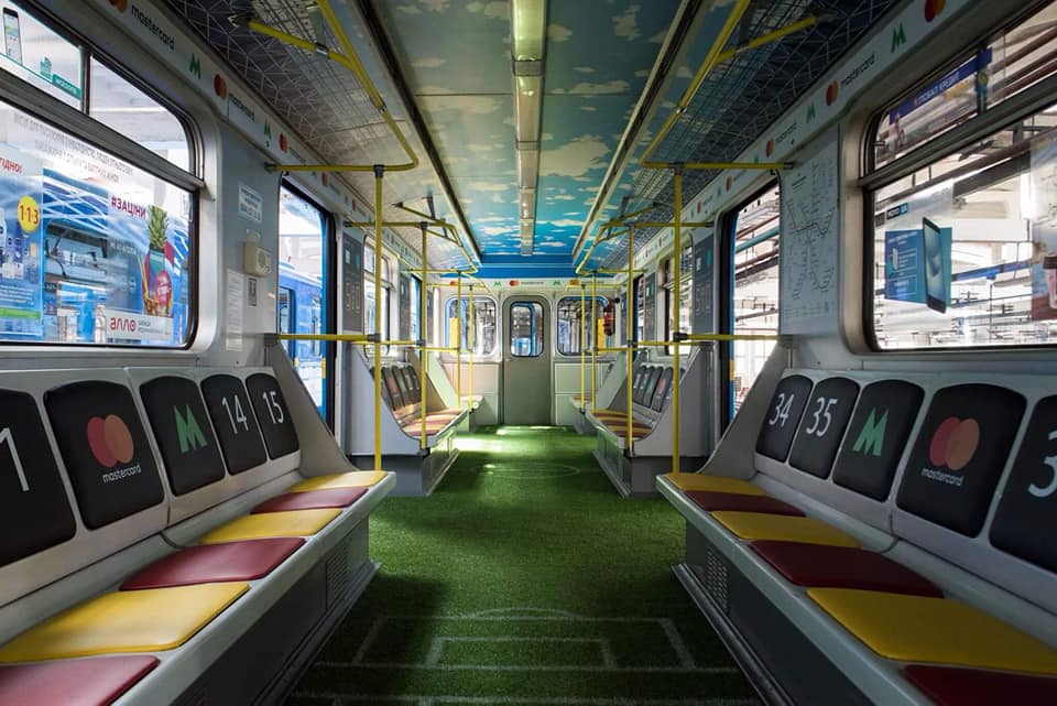 Вагон метро стилизованный под футбольное поле. На спинках сидений обозначены номера "игроков".