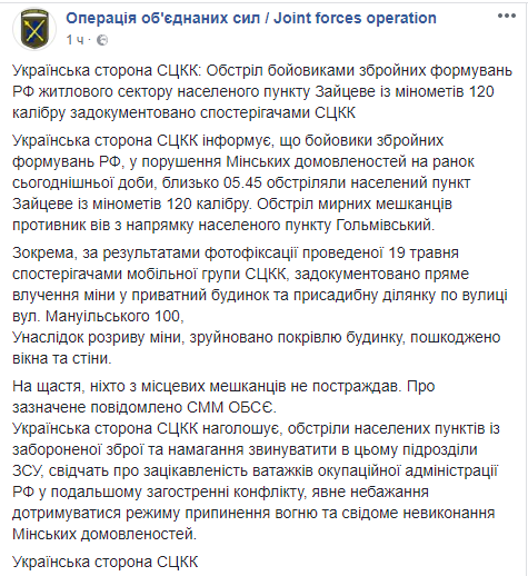 Утром 19 мая населенный пункт Зайцево в Донецкой области попал под обстрел.