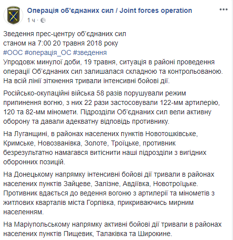 Об этом сообщает пресс-центр ООС в Facebook.