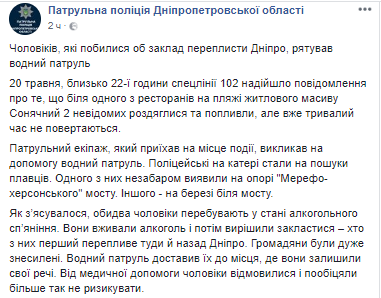 В Днепре два нетрезвых посетителя реторана решили на спор переплыть реку Днепр туда и обратно. Об этом сообщает пресс-служба патрульной полиции на своей странице в Facebook.
