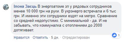 Журналист Илона Заец, которая возглавляет пресс-службу НАК "Энергоатом": "В Энергоатоме зарплата у рядовых сотрудников менее 10 000 грн на руки. В Укрэнерго встречала и 6 тыс грн. И именно эти сотрудники ездят на метро. Сравнение со средней недопустимо. С минимальной - да. И не забывать, что коммуналка с отоплением до 2000 дотягивает".