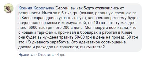 "Имея зп в 6 тыс грн (думаю, реальную среднюю зп в Киеве справедливо указать такую), человек попрежнему будет недоволен сервисом и коммуналкой, но 10 грн - это ту мач для него. 6000 тыс грн - это 200 в день. Моя подруга посчитала, что с новыми тарифами, проживая в Броварах и работая в Киеве, она будет вынуждена тратить 50-60 грн в день на проезд. 60 грн это 1/3 дневного заработка. Это адекватное соотношение дохода и расходов на транспорт, вы считаете?"