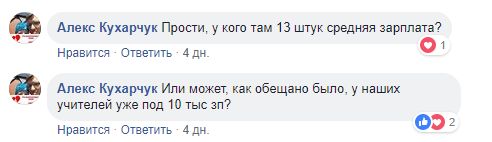 Однако в комментариях под постом Русина с ним не согласились сразу несколько человек. Так, Алекс Кухарчук пишет: " Прости, у кого там 13 штук средняя зарплата? Или может, как обещано было, у наших учителей уже под 10 тыс зп?"