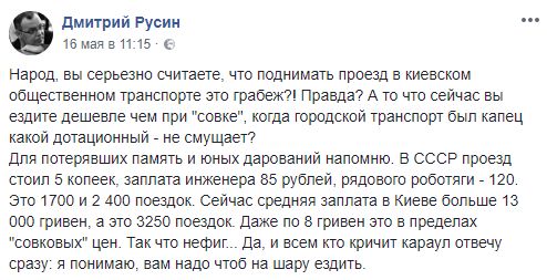 Политтехнолог Дмитрий Русин считает, что цена вполне обоснована, и не согласен с теми, кто возущен подорожанием: "Народ, вы серьезно считаете, что поднимать проезд в киевском общественном транспорте это грабеж?! Правда? А то что сейчас вы ездите дешевле чем при "совке", когда городской транспорт был капец какой дотационный - не смущает?