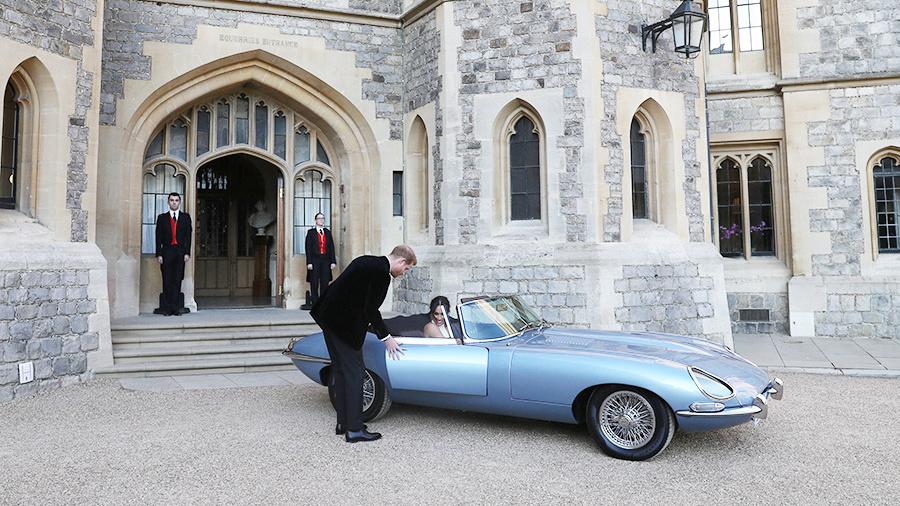 Представитель британской королевской семьи принц Гарри и его супруга актриса Меган Маркл уехали со свадебной церемонии на электромобиле Jaguar E-Type Concept Zero.
