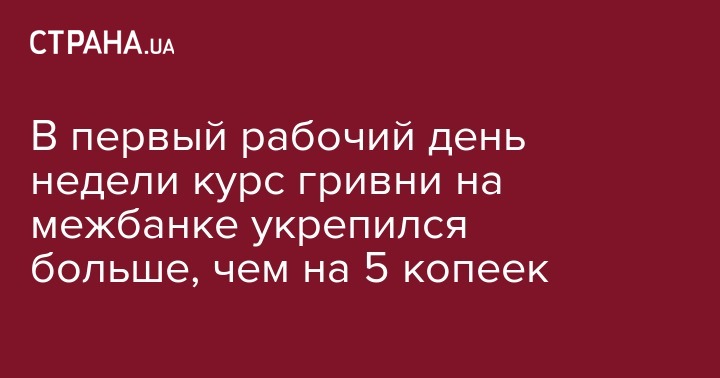 В первый рабочий день недели курс гривни на межбанке укрепился больше, чем на 5 копеек