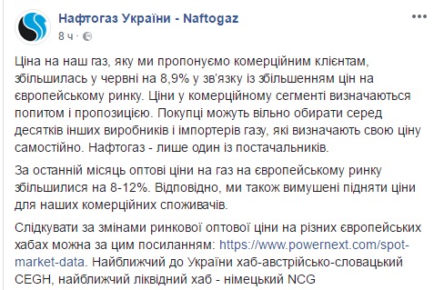 "За последний месяц оптовые цены на газ на европейском рынке увеличились на 8-12%. Соответственно, мы также вынуждены поднять цены для наших коммерческих потребителей", - поясняет "Нафтогаз" на своем блоге в Facebook.
