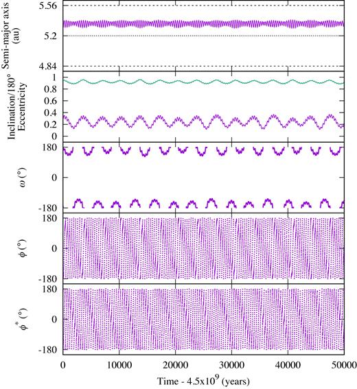 Evolution of a stable co-orbital clone’s orbital elements near 4.5 billion years in the past. The location of the semimajor axis is shown with respect to Jupiter’s co-orbital region (dashed lines). Inclination is normalized to 180° and corresponds to the top curve in the corresponding panel whereas eccentricity is the bottom curve. The possible resonant arguments ω, ϕ, and ϕ⋆ are defined in Section 3. Фото: academic.oup.com