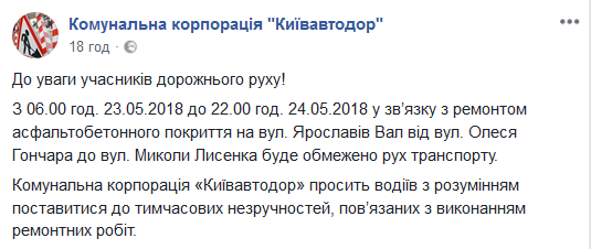 "С 06:00 23 мая по 22:00 24 мая в связи с ремонтом асфальтобетонного покрытия на ул. Ярославов Вал от ул. Олеся Гончара до ул. Николая Лысенко будет ограничено движение транспорта", - уточнили в пресс-службе "Киевавтодора".
