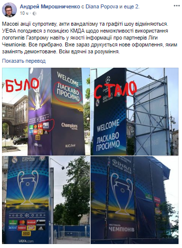 "Массовые акции протеста, акты вандализма и граффити-шоу отменяются. УЕФА согласилась с позицией КГГА о невозможности использования логотипов "Газпрома" даже как информации о партнерах Лиги Чемпионов. Все убрано. Уже сейчас печатается новое оформление, которым заменят демонтированное. Всем благодарны за понимание", - написал Мирошниченко.