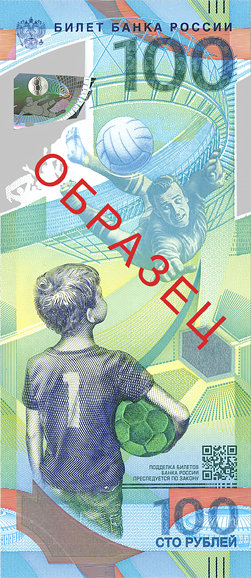 "Художественная композиция лицевой стороны банкноты символизирует преемственность поколений - мальчик мечтает повторить достижения великих футболистов, таких как вратарь Лев Яшин, имя которого вписано в историю мирового футбола.