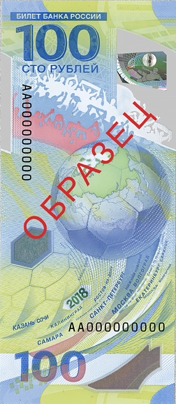В ультрафиолетовом свете становятся видимыми официальные логотип и эмблема Чемпионата мира по футболу FIFA 2018. Тираж памятной банкноты составит около 20 млн экземпляров.
