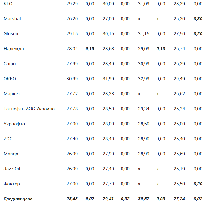 В частности, на 0,30 грн./л подорожали все виды топлива на заправках UPG: А-92 – до 28,00 грн/л, А-95 – до 29,00 грн/л, А-95+ – до 31,80 грн/л, ДТ – до 26,20 грн/л. В сети AMIC бензины и дизельное топливо подорожали на 0,20 грн/л.