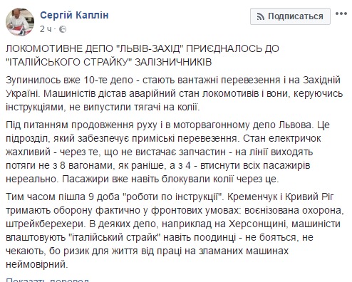 Каплин сообщил, что Кременчуг и Кривой Рог, где также проходит  "итальянская забастовка", держат оборону практически во фронтовых условиях. В некоторых депо, например на Херсонщине, машинисты устраивают "итальянскую забастовку" даже в одиночку - не боятся, не ждут, потому что риск для жизни от работы на сломанных машинах невероятный".