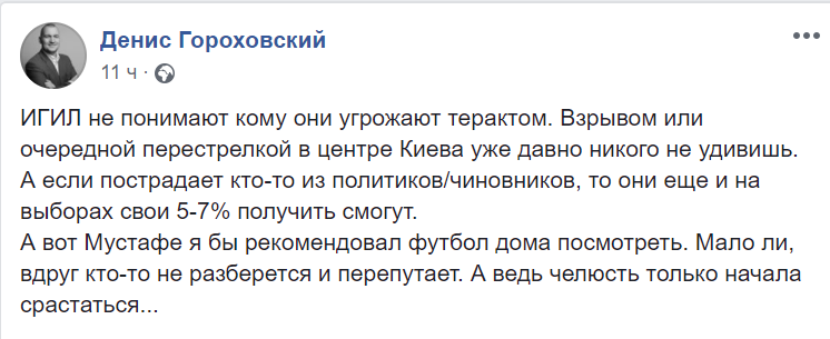 "ИГИЛ не понимают кому они угрожают терактом. Взрывом или очередной перестрелкой в центре Киева уже давно никого не удивишь. А если пострадает кто-то из политиков/чиновников, то они еще и на выборах свои 5-7% получить смогут".