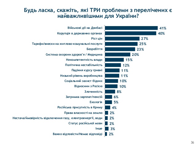 Главными проблемами страны украинцы называют войну на Донбассе, коррупцию, рост цен, заоблачные тарифы на коммунальные услуги. Замыкают пятерку безработица и медицина.