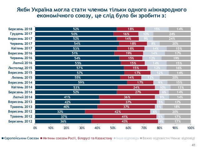 В марте 2018 года за вступление Украины в Европейский союз высказались 52% опрошенных. За присоединение к противоположной интеграционной организации - Таможенному союзу РФ, Беларуси и Казахстана - выступают 18%.